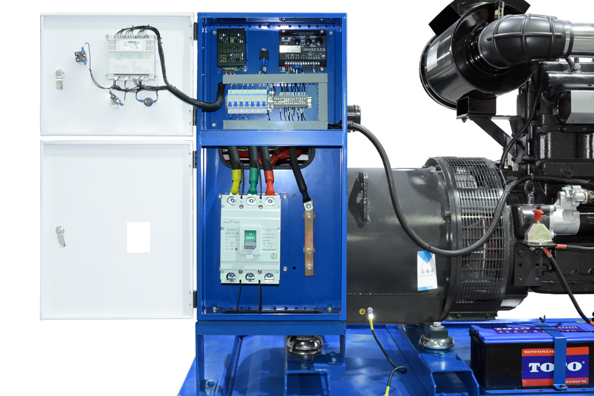 Шкаф управления электростанцией TSS Standart расположен на несущей раме и обеспечивает удобный доступ к контроллеру в любых вариантах исполнения дизельного генератора. Внутри располагается автомат защиты генераторной установки. Подключение потребителей электрической энергии производится к входным клеммам автомата защиты.На лицевой панели шкафа управления размещены органы управления и визуального контроля за работой генераторной установки. Панель управления дизельного генератора снабжена графическим дисплеем с русским языком и удобна в работе при любых условиях эксплуатации.